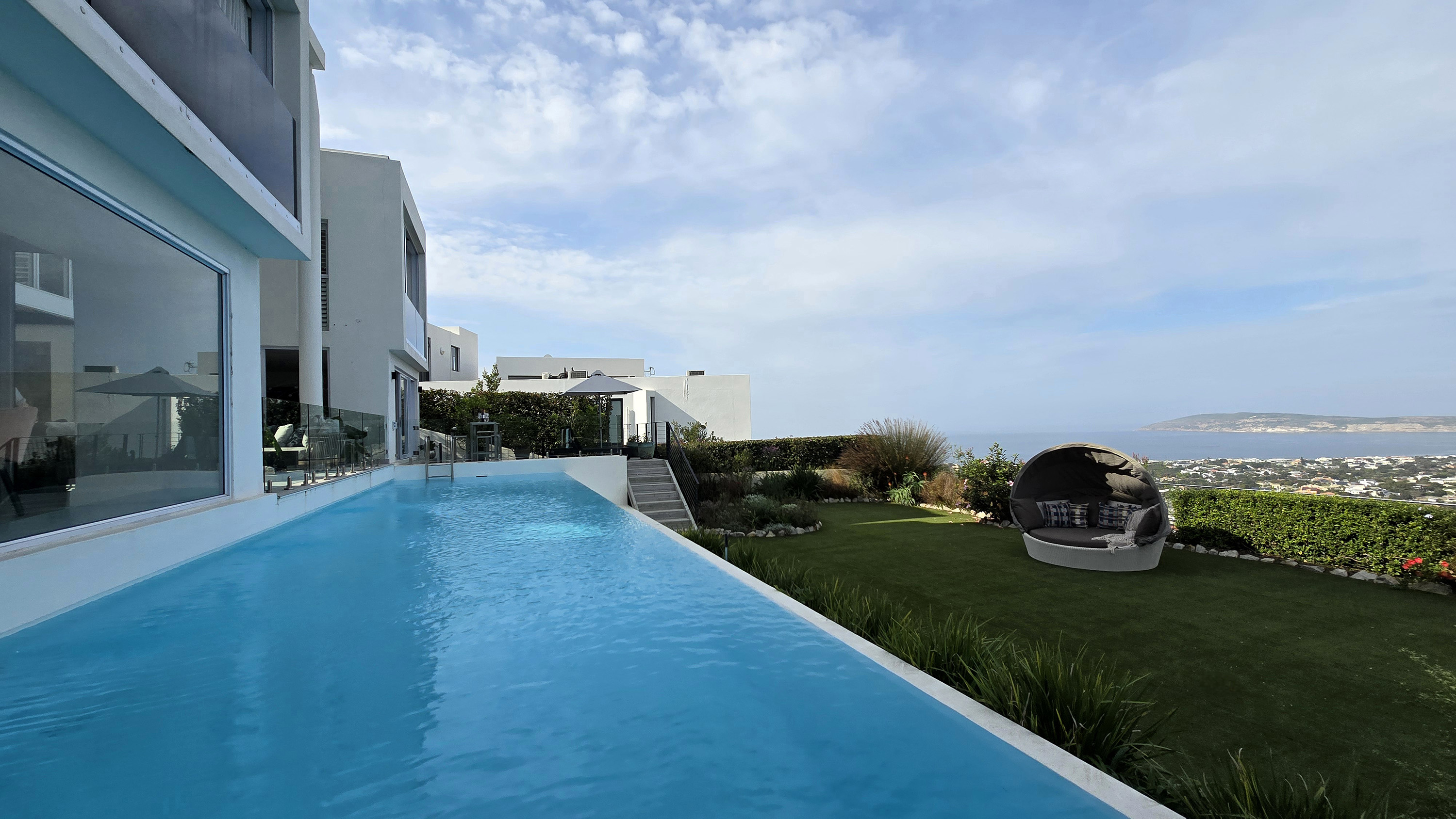 Cutty Sark Villa sits above the bay on a gentle hill, and even the driveway conveys that feeling of generous calm that runs through the entire architecture of the house. Large glass fronts open the view toward the Indian Ocean, terraces flow seamlessly into garden areas, and the pool appears to merge with the horizon so that the blues of water and sky blend into one another. It is architecture that does not seek to impress, but to create space – space for light, space for movement, space for that quiet form of comfort that only fully reveals itself after a few hours.
